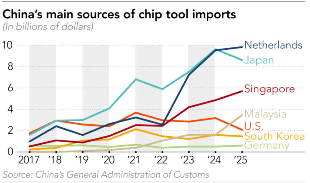 21、在美国出口管制背景下,中国芯片设备进口来源中,源自美国的直接进口额降至约20亿美元的八年低点,而来自新加坡与马来西亚的进口额则分别飙升至创纪录的57亿及34亿美元。这一结构性转变的主要原因是,应用材料、泛林集团等美国设备制造商为规避本土管制,已将其制造产能大量转移至东南亚,通过这些新制造基地继续服务中国市场。