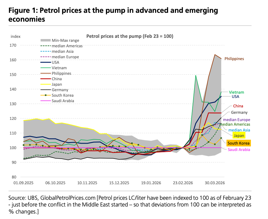 2、瑞银:一种普遍观点认为,霍尔木兹海峡一旦关闭,高度依赖中东石油的亚洲将遭受更大冲击。现实中,亚洲多国已出现能源配给措施,如斯里兰卡缩短工作周、新加坡配给航运燃料、缅甸限行、多国限制空调使用、孟加拉国关闭大学,以及中国和泰国禁止成品油出口,加剧区域供应紧张。然而,汽油零售价格走势却呈现不同图景:除菲律宾(涨幅61%)和越南外,多数亚洲国家油价涨幅中位数约15%;而美国涨幅高达35%,居全球第三。这表明,消费者对油价冲击的敏感度更多取决于燃油税和补贴政策,而非进口依赖程度——美国燃油税占比不足20%,而欧洲约50%,高税率缓冲了价格传导。许多政府也通过价格上限或补贴减轻冲击。