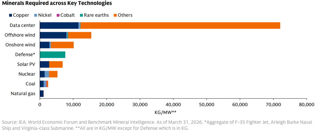 6、未来关键技术的矿物密集度显示,数据中心、风力发电等新兴领域对铜、稀土等材料的需求远超传统能源。每兆瓦数据中心建设需消耗超7万公斤矿物,海上风电对铜和稀土的需求尤为突出,而国防系统则高度依赖稀土。人工智能、电气化及国防现代化等核心长期主题均依赖于相同的物理资源基础,全球经济的增长瓶颈正从资本转向关键材料的物理供应。