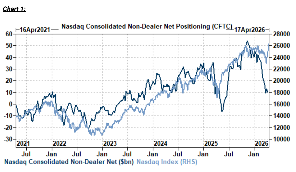 19、高盛:过去一周,伊朗潜在协议乐观情绪推高美股(纳指+6.2%,罗素+5.9%,标普+4.7%),迫使市场参与者从低仓位水平加仓。美国股市系统化持仓由空转多(~50%分位),主经纪商业务净杠杆率微升,美股现金产品资金流转正。相对于标普500和罗素2000,纳斯达克持仓仍低迷;截至4月7日CFTC数据显示非做市商净多头接近2025年上半年低点(两年回溯第11百分位)。但结合此后92亿美元未平仓合约增加,显示多头温和反弹。当前格局类似2025年一季度——超大型科技股财报强劲且极端关税情景消除,推动指数二季度上涨18%(标普+11%,罗素+8%)。在此背景下,纳斯达克有望凭借轻仓、2026年一季度科技盈利前景向好及地缘政治与政策担忧缓解而跑赢。