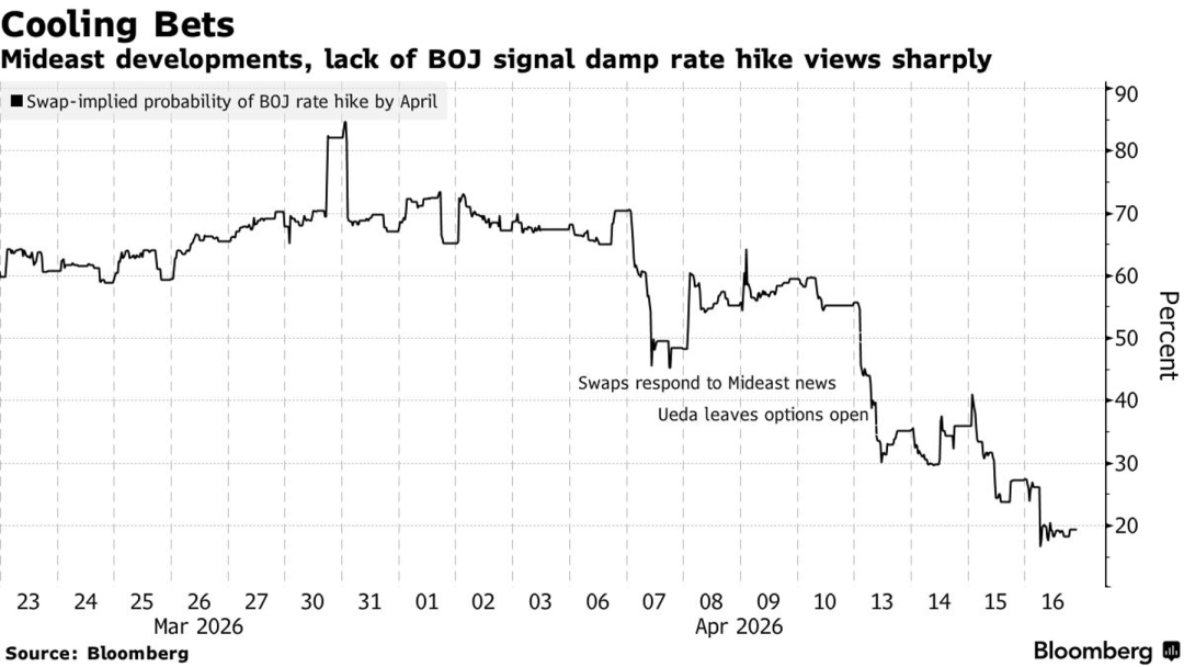 1、受中东局势发展以及日本央行缺乏明确政策信号的影响,互换市场数据显示,市场对日本央行在4月加息的预期概率已大幅降温,从4月初的约70%骤降至4月16日的约19%。市场预期的转变主要源于日本央行行长植田和男的表态——他强调能源价格上涨带来了通胀上行和经济下行的双重风险,使政策应对变得异常困难,因此他避免在月底的政策会议前给出明确指引。