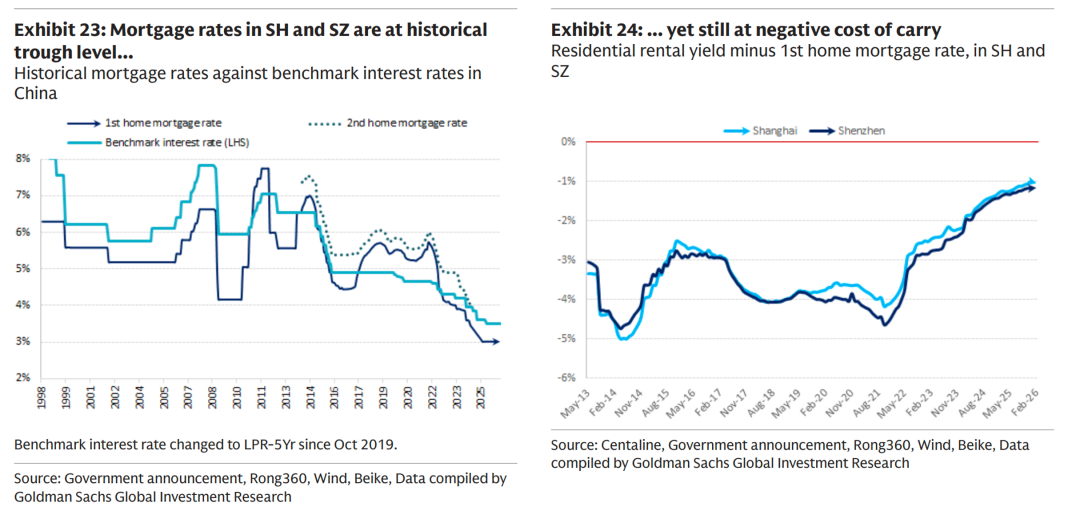6、尽管抵押贷款利率已降至历史性低点,但上海和深圳的住宅资产仍处于负持有成本状态,即住宅租金收益率仍无法覆盖首套房的贷款利率,两者差额当前约为负1%。不过,这一负利差已是近年来的最高水平,远优于2021年低于负4%的谷底。这种看似不经济的投资行为,其背后逻辑在于房产与学区、户口及本地更优的医疗和养老金保障绑定的社会性溢价。
