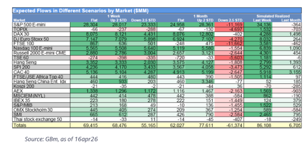 18、高盛:上周,CTA再度净买入690亿美元全球股票,其中450亿美元投向美国股票(其余为非美权益)。但需注意:370亿美元流向非美市场(含巴西、亚洲等),意味着CTA对美股的净敞口仍为净空头(即:买非美 > 买美股,整体仍偏空);CTA对VWAP风格的交易延续昨日模式——极少关注新闻事件,更多依赖技术信号;我们认为,CTA仓位变动对短期市场影响显著,若其开始系统性回补空头,将构成重要上行动能。