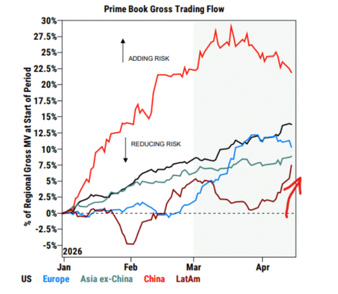 9、高盛:毫不意外,拉丁美洲(LatAm)是本月对冲基金(HF)增持敞口最多的地区。