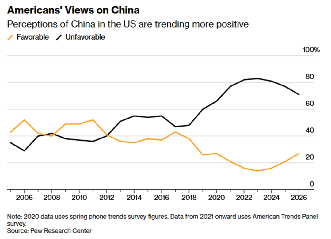 1、根据皮尤研究中心2026年3月的调查,美国民众对中国的积极看法已连续第三年回升,持有好感的比例达到27%,较2023年因贸易战和新冠疫情等因素创下的历史低点接近翻倍。与此同时,对华持负面看法的比例已从2023年接近80%的峰值回落。