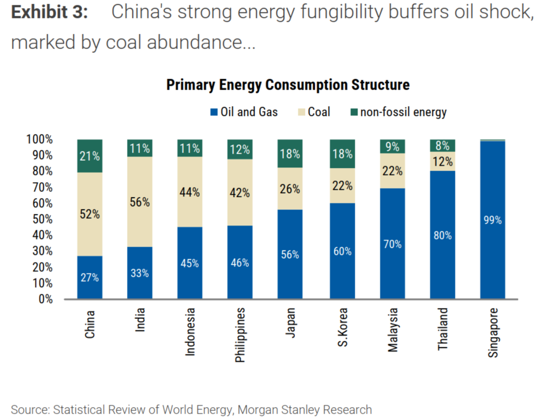 7、摩根士丹利分析指出,中国拥有三层独特机制,使其在能源危机中处于相对有利地位。其一,以煤炭(约占56%)和可再生能源(约占18%)为主的多元化能源结构,辅以原油战略储备,能确保国内高耗能制造业的生产优势,成熟的化学品产业链也能在油价上涨时提供石油产品的替代。其二,发改委的定价机制为消费价格提供缓冲,缓解能源成本对居民购买力的直接冲击。其三,中国目前较低的CPI同比增速赋予政策更大灵活性,可在石油冲击加剧时,通过前置财政支出和适度货币宽松等措施对冲风险。