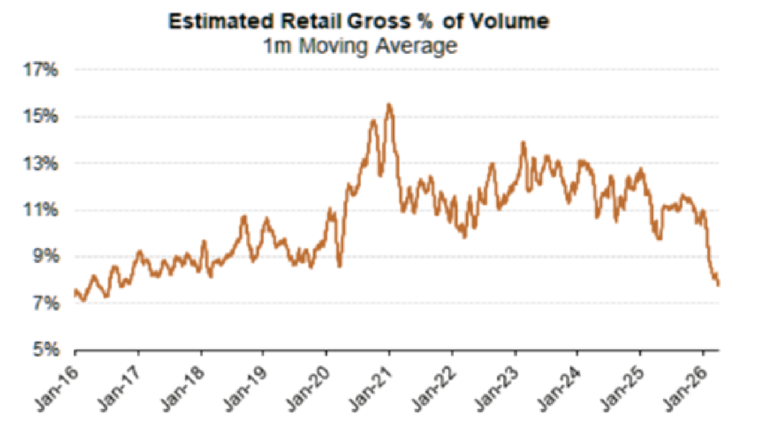 15、散户投资者在美股市场总交易量中的占比已回落至疫情前的水平,目前已从2021年初的15%以上跌破9%。