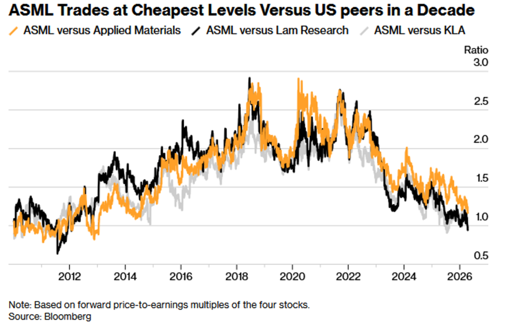21、荷兰芯片设备制造商阿斯麦(ASML)相较于其美国同行的估值溢价已收缩至十年低点。目前其远期市盈率约为37倍,对应用材料公司的溢价降至17%,是2014年以来的最低水平。同时,阿斯麦相对泛林集团的估值出现了14年未见的5%折价,与科磊公司的市盈率也基本持平。该估值差距的收窄源于股价表现差异:尽管阿斯麦年初至今上涨36%,但应用材料与泛林集团的涨幅均超过50%。