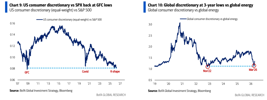 20、美银(哈特内特):我们继续推荐做多消费。美国可选消费板块相对于必需消费,已跌至2008年金融危机和2020年新冠疫情时期的相对低位(等权重计算——见图表9);全球可选消费板块相对于能源股处于三年低位(见图表10);该板块已充分定价“滞胀”预期,是我们最喜欢的逆势多头策略,用以押注特朗普在战后转向解决可负担性问题并挽回低迷的支持率;同时也是对冲2020年代下半年选举风向从“民粹资本主义”转向“民粹社会主义”的绝佳方式。