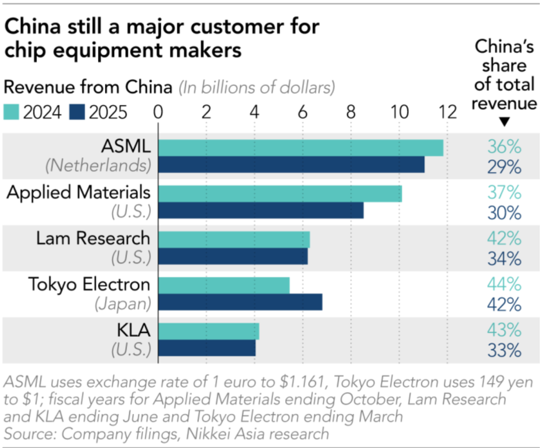 22、中国市场在2025财年依然是全球半导体设备巨头的核心收入来源:美国的应用材料、泛林集团与科磊三家公司从中国获得的合并收入接近190亿美元,占各自总销售额的比例均超过30%;日本的东京电子对华收入占比更是超过40%;荷兰阿斯麦(ASML)也达到29%。通过将生产基地转移至东南亚等地的供应链多元化策略,美国及其他国家的供应商成功维持了对华业务规模,绕开了直接的出口限制。