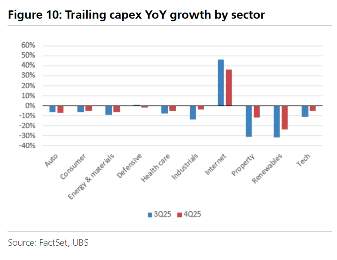 8、2025年下半年,除互联网行业实现约40%的增长外,中国所有行业的资本支出均出现同比收缩。