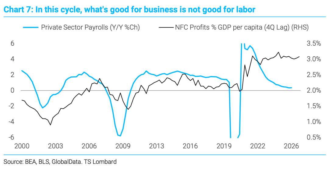3、美国企业盈利与就业增长之间的历史关系在本轮周期中出现脱节。尽管非金融企业利润占人均GDP的比重在滞后四个季度后仍维持在约3.0%的高位,但私营部门的薪资雇员同比增长率已急剧下滑至接近零。