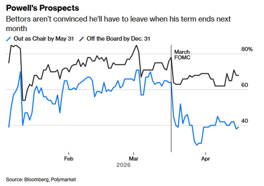 2、根据Polymarket预测市场数据,市场参与者认为美联储主席鲍威尔将在2026年12月31日前离任的概率持续稳定在60%以上,但认为其将在5月31日卸任主席一职的概率在3月联邦公开市场委员会会议后,从接近60%的水平大幅降至40%以下。