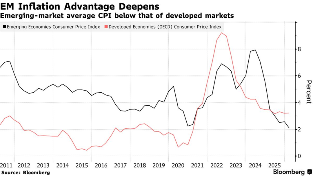 1、新兴市场与发达经济体的通胀率出现显著分化:一项彭博加权平均通胀指标显示,新兴经济体通胀率在第一季度降至2.12%的历史低点,而发达市场通胀率则升至3.21%。这种低通胀环境为新兴经济体应对油价冲击提供了缓冲,使其央行能够推迟或避免加息,这与可能被迫更快采取紧缩政策的发达国家不同。由于新兴市场在疫情后已提前加息并维持了较高的实际利率,当前具备了更大的政策灵活性,从而提升了其本币债券对投资者的吸引力。