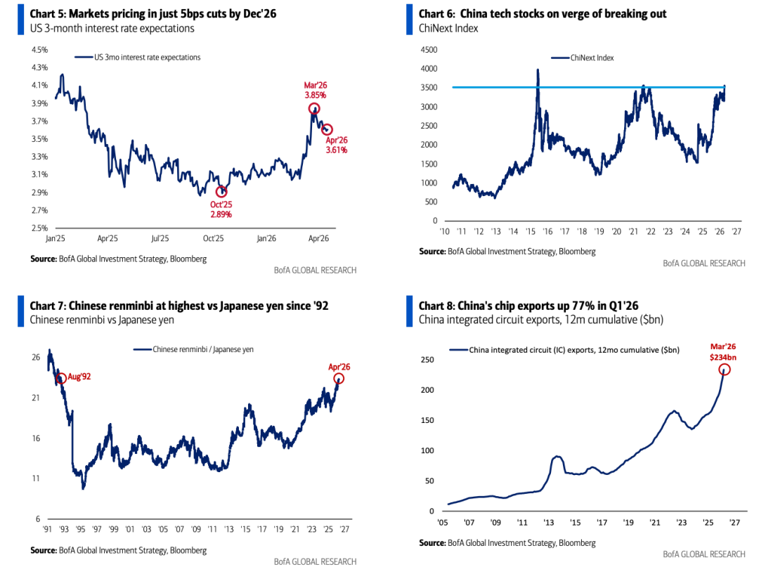 23、美银(哈特内特):我们依然推荐做多中国(Buy China)。自特朗普就职以来,最大赢家正是美中AI战争的胜出者(美国半导体、亚洲科技、加拿大/拉美原材料)……中国科技股正大幅追赶:创业板指(ChiNext)突破(见图表6),中国科技出口同比增长43%(达2340亿美元——见图表8);人民币兑日元处于1992年8月以来最高(见图表7),兑韩元处于2009年2月以来最高;且中国拥有充足能源支撑AI发展(可再生能源、俄罗斯石油等)。