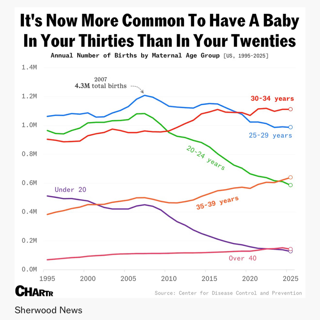 10、根据美国疾控中心的数据,2025年美国总和生育率降至历史新低的53.1,即每千名15至44岁女性对应53.1名新生儿,低于2024年的53.8。年度总出生人口连续第六年维持在约360万,较2007年的峰值430万减少约70万。年龄结构上,生育主力已从20多岁女性转向30多岁女性,其中30至34岁年龄组的年生育人口数达到110万,超过25至29岁年龄组的约99万。同时,35至39岁女性的生育率首次超过20至24岁的女性。此外,40岁以上女性的年均新生儿数量(约14.7万)已连续三年超过20岁以下女性(约13.6万)。