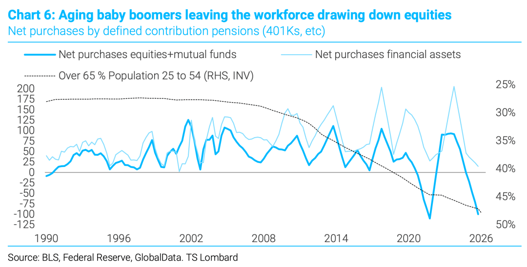 11、美国人口结构变化正重塑资产流向:随着婴儿潮一代步入退休阶段,固定缴款养老金计划已转为股票和共同基金的净卖出方,导致金融资产的净购买量放缓。这一代际的资产配置正从股票转向美国国库券与中期票据等债务工具,实际收益率的上升则加速了这一转换过程。