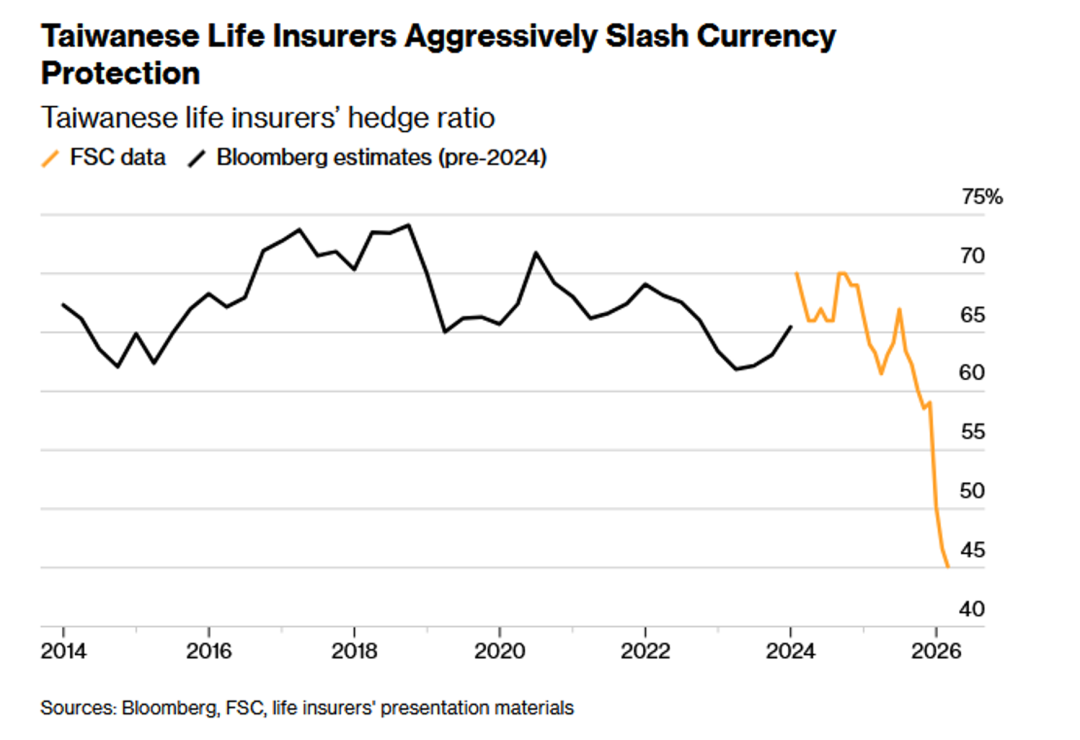 16、台湾自2026年起实施的新会计准则,允许寿险公司将汇兑损益在债券剩余期限内分摊,直接改变了其对高达7247亿美元海外资产的风险管理模式。由于不再需要立即确认汇率波动对当期损益的冲击,保险公司大幅削减成本高昂的货币对冲,使其外汇对冲比率在2026年2月降至45.1%的历史最低水平,显著低于2018年74%的峰值。这一结构性转变导致离岸远期市场的美元对冲需求近乎消失,进而缓解了新台币的升值压力。