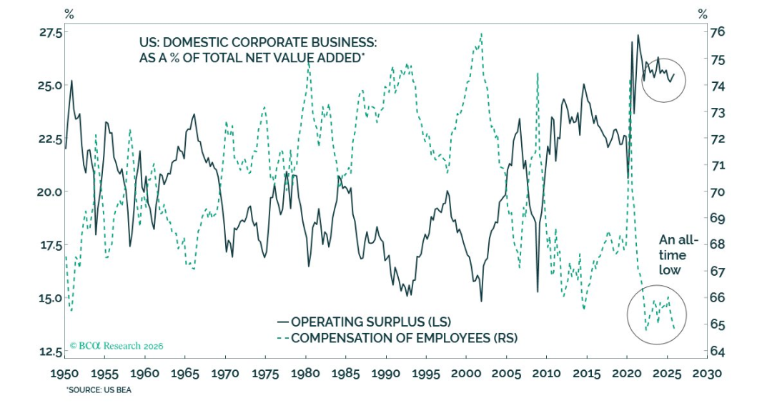 4、BCA:在美国,股东继续相对于员工占据优势。在整个经济体系中(不仅限于上市公司),企业营收中利润(营业盈余)所占比例仍处于历史高位,而员工薪酬占比则降至有史以来的最低水平。毫不奇怪,美国股市屡创新高,但普通家庭却正面临严重的可负担性危机。而这还只是在人工智能尚未大规模取代工作岗位之前的情形。