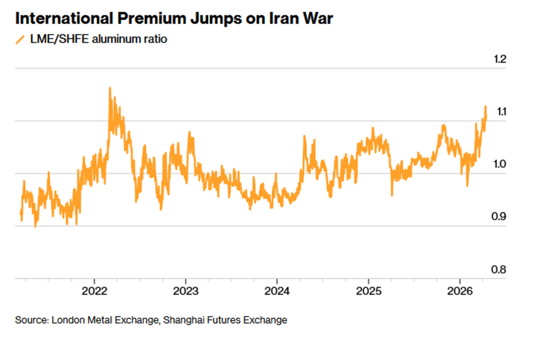 3、受中东地缘冲突影响,伦敦金属交易所(LME)铝价相对于上海期货交易所(SHFE)的溢价在2026年初飙升,两者比率突破1.1,达到自2022年以来的最高点。这一价差为中国生产商创造了重要的出口机会,因为战争扰乱了占全球约9%产量的波斯湾地区供应;而与此同时,中国的铝库存已攀升至六年高位。由于国际买家积极寻求替代供应,预计中国的铝出口量将大幅增加,年度出口额有望挑战2024年创下的670万吨的历史记录。
