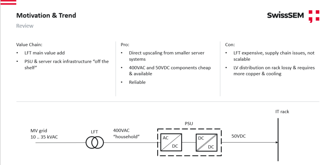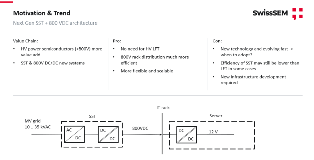 在此背景下,800V直流配电架构凭借其更高的输电效率、更简化的系统拓扑和更优的功率密度,正逐步成为数据中心能源系统升级的主流方向。固态变压器(Solid State Transformer, SST)作为实现中压交流到低压直流高效变换的核心设备,可在无需传统低频变压器的情况下完成能量转换,显著提升系统灵活性、可扩展性和整体能效。