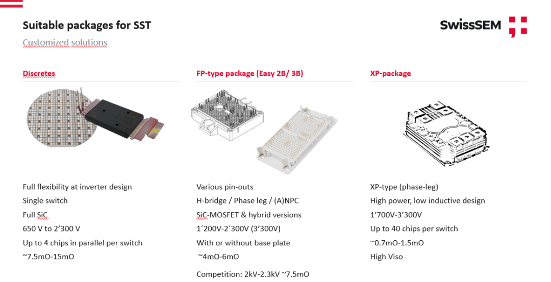 SwissSEM 2300V SiC MOSFET具备优异的静态和动态特性:在150°C结温条件下,导通电阻RDS(on)仅为45mΩ,开关损耗控制达到业界领先水平,充分满足固态变压器高频、高功率密度的应用需求。