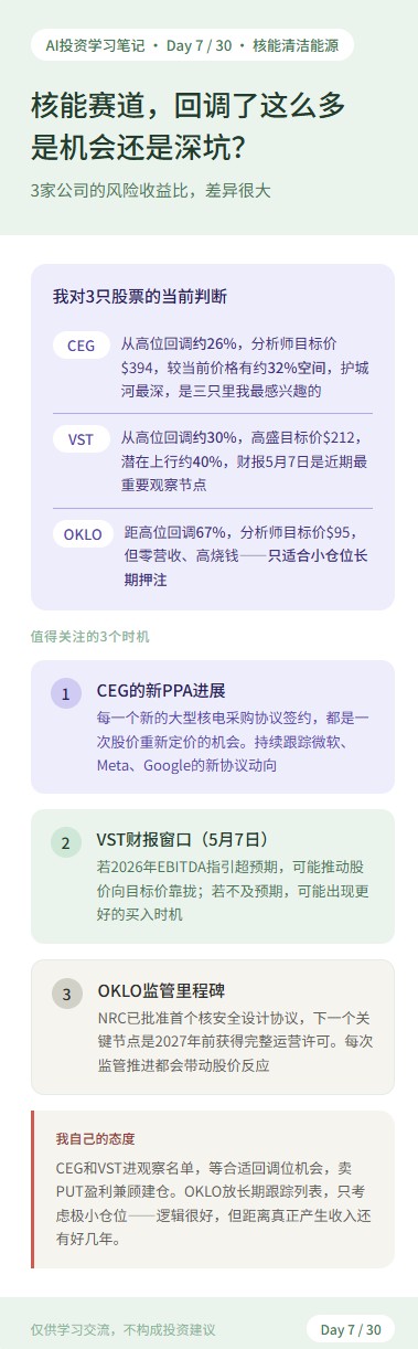 CEG是这三只里我觉得最值得关注的——从高位回调26%,基本面没有变化,核电护城河极深,分析师目标价和当前股价之间仍有约32%空间。
