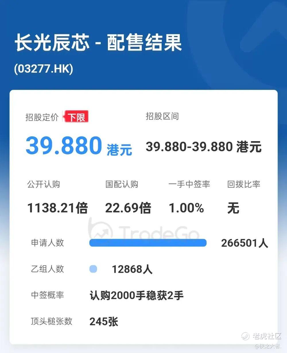 配售结果显示,长光辰芯本次申购人数共266501人,公开认购1138.21倍,国配认购22.69倍,无回拨,一手中签率1.00%。