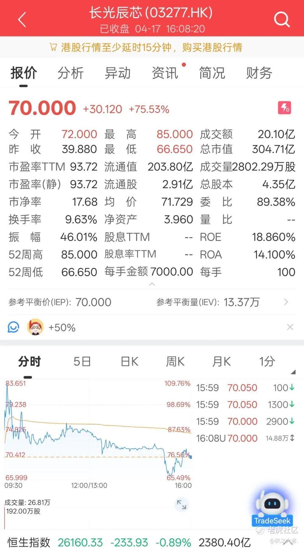 上市首日,公司股价高开80.54%,报72.00港元,开盘最高冲至85.00港元,最终收至70.00港元,涨75.53%。首日收盘总市值达304.71亿港元,全天成交额约20.10亿港元。若按收盘价计,每手中签赚约3012港元。