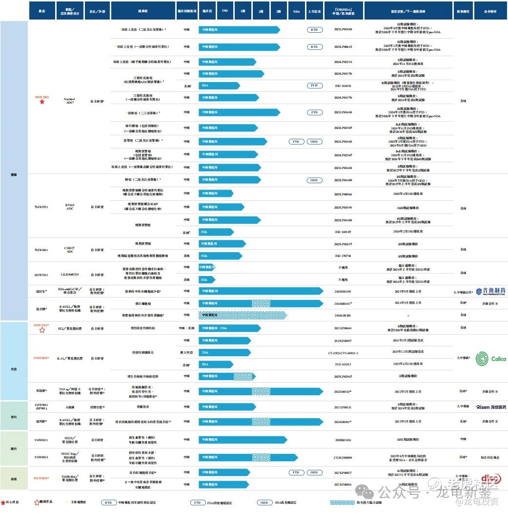 迈威生物(Mabwell)是一家成立于2017年的创新型生物制药公司,专注于通过其专有的ADC(抗体偶联药物)技术平台及其他研发平台,开发用于治疗肿瘤及年龄相关疾病的创新药物。公司的核心业务涵盖从药物发现、临床开发到商业化的全产业链,目前拥有一款处于关键注册临床阶段的核心产品9MW2821(一款靶向Nectin-4的ADC,用于治疗尿路上皮癌、宫颈癌等实体瘤),以及包括7MW3711(靶向B7-H3 ADC)和7MW4911(靶向CDH17 ADC)在内的差异化ADC管线。此外,公司已实现多款生物类似药的商业化,包括迈利舒®(地舒单抗,用于骨质疏松)、迈卫建®(地舒单抗,用于骨巨细胞瘤)及君迈康®(阿达木单抗),并拥有涵盖免疫、肿瘤、骨科及眼科等领域的丰富在研产品组合。