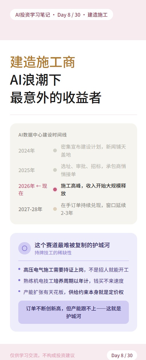 这个赛道是前几天讲过的"滞后效应"逻辑最直接的受益者——2024-2025年宣布的AI园区,2026年才是真正的施工高峰。