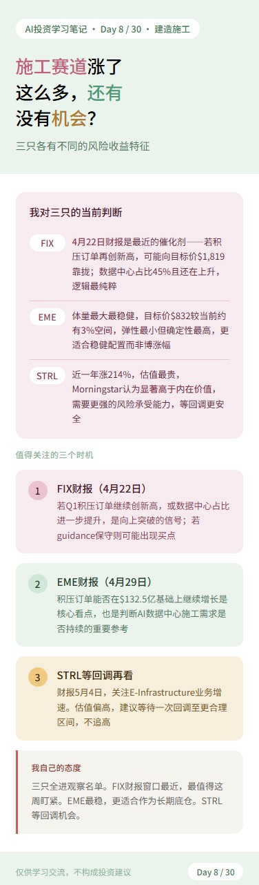 -Sterling Infrastructure(STRL) 专注数据中心场地开发和土建,近一年涨幅约+214%。4月20日收盘$472,52周区间$129→$477,积压订单$30.1亿(+78%),2026年全年revenue guidance $31-32亿。财报5月4日。