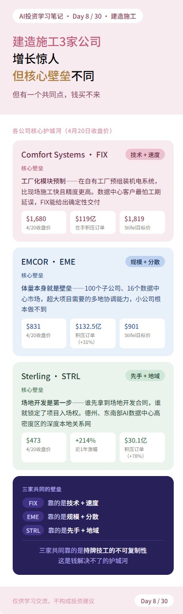 -Comfort Systems USA(FIX) 专做机电工程(MEP)和精密冷却施工,数据中心占其营收已达45%。2025年全年营收$91亿(+30%),EPS同比+98%,在手积压订单$119亿(年内几乎翻倍)。4月20日收盘约$1,680,52周区间$322→$1,672,Stifel刚于4月16日上调目标价至$1,819。财报4月22日。