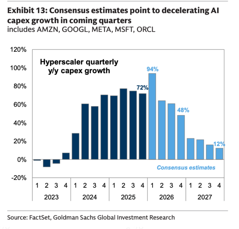 8、共识预测显示,未来几个季度超大规模云服务商(hyperscaler)的资本支出增速将逐步放缓,这反过来可能将导致科技板块收入增速放缓。然而,这些资本支出预测已被多次上调,仅上个季度就将2026年资本支出预测上调了约1300亿美元。
