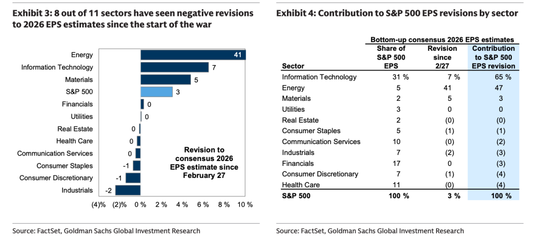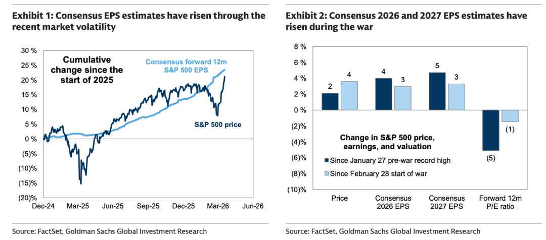 1、自战争爆发以来,市场对标普500指数2026年和2027年每股收益(EPS)的共识预期分别上调了3%。因此,尽管标普500指数本周收于比战前1月高点高出2%的水平,但当前21倍的市盈率(P/E)却比1月时低了5%。虽然股价通常比共识盈利预期变动更快,但近期盈利预期的上修与去年同期因关税引发市场波动时期分析师预测谨慎横盘的轨迹形成鲜明对比。