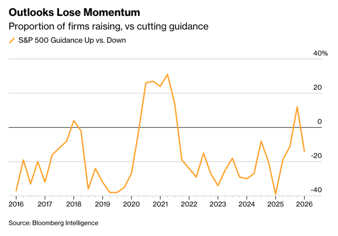 10、尽管标普500指数成分公司在2026年第一季度预计实现12%的盈利增长,且已公布业绩平均超出预期11%,但企业的前瞻指引正出现恶化。衡量上调与下调指引公司比例的指标已从2025年末约+15%的高位跌至负20%以下,同时已有40家公司下调季度展望,为2025年第二季度以来最多。在不确定性影响下,市场对负面指引的反应尤为激烈——即使季度业绩超预期,下调指引的摩根大通股价依然承压;而完全撤回业绩指引的BRP Inc.和阿尔斯通(Alstom SA)股价则分别暴跌35%与36%。