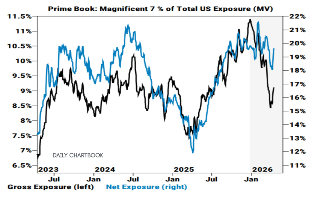 6、高盛经纪数据显示,对冲基金于4月已重新开始增持“七巨头”的股票,其净风险敞口从年内低点约15%回升至18%左右。但基金在该领域的整体头寸水平仍远低于2026年初超过21%的峰值。