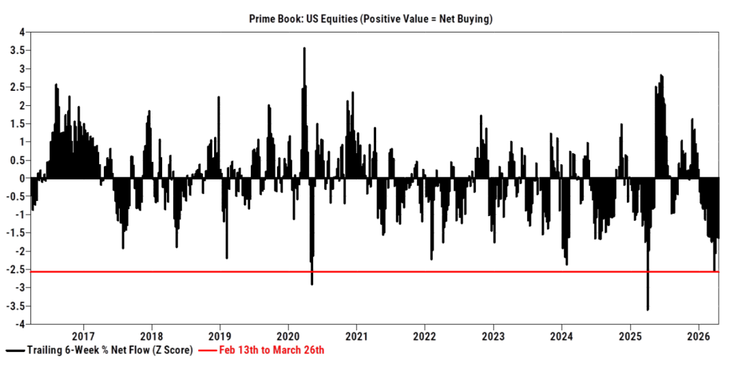 1、高盛主经纪商(PB)的图表展示了冲突最艰难时刻对冲基金抛售规模之巨。另两次显著抛售分别对应新冠疫情初期与“解放日”(Liberation Day)事件。这有力说明了密切监控资金流向(flow-of-funds)的价值。