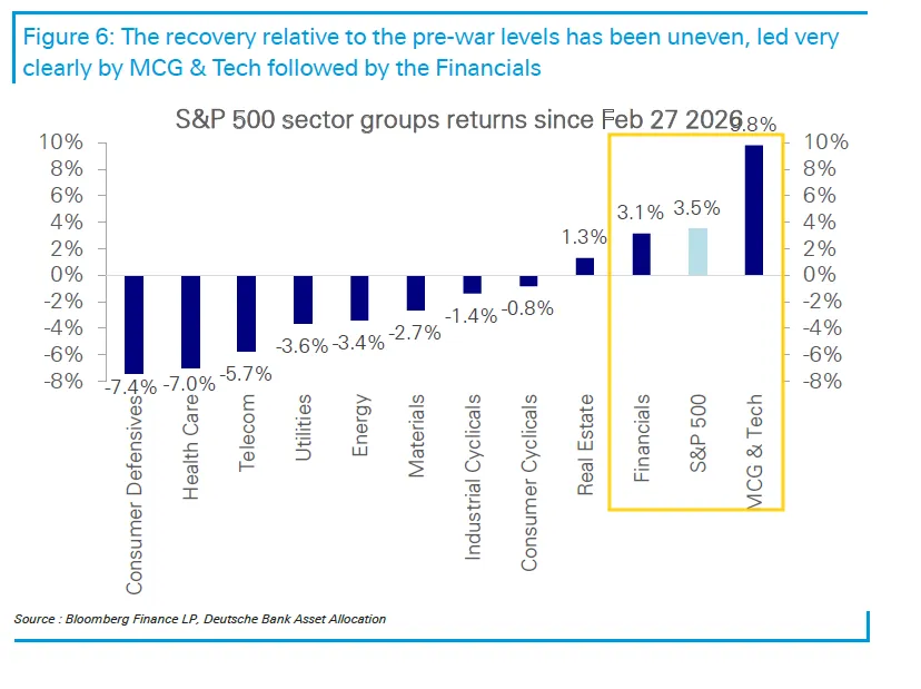 2、在美股所有板块中,涨幅超过战前水平最多的是媒体、通信与科技(MCG & Tech)板块,其次是金融板块——因为这两个板块此前在强劲的盈利增长与薄弱的市场仓位之间存在最大的落差。大多数其他板块目前仍低于战前水平,而在利率仍处于高位的环境下,表现落后的正是那些类债券的防御性板块。