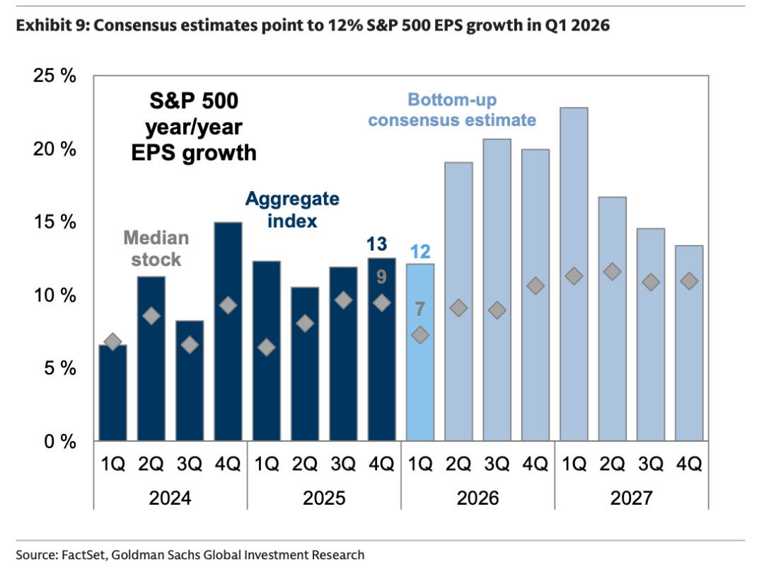 7、即将发布的2026年第一季度财报将是对当前盈利预期的关键检验,并可能成为进一步修正盈利前景的催化剂。本周将有94家公司公布财报,其市值合计占标普500总市值的15%。目前分析师预计本季度标普500 EPS同比增长12%,这是自2021年以来财报季开始时最强劲的增长预期;随后在2026年剩余时间,增速预计将急剧加快至约20%。