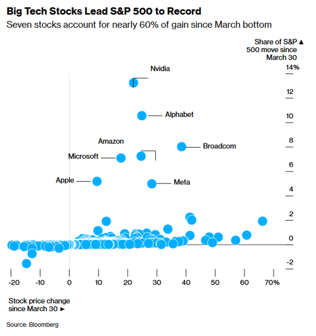 3、事实上,自3月30日市场触底反弹以来,标普500指数的上涨动力高度集中于少数大型科技股,其中英伟达、亚马逊、微软、博通、Alphabet、Meta和苹果七家公司的贡献占指数总涨幅的近60%。