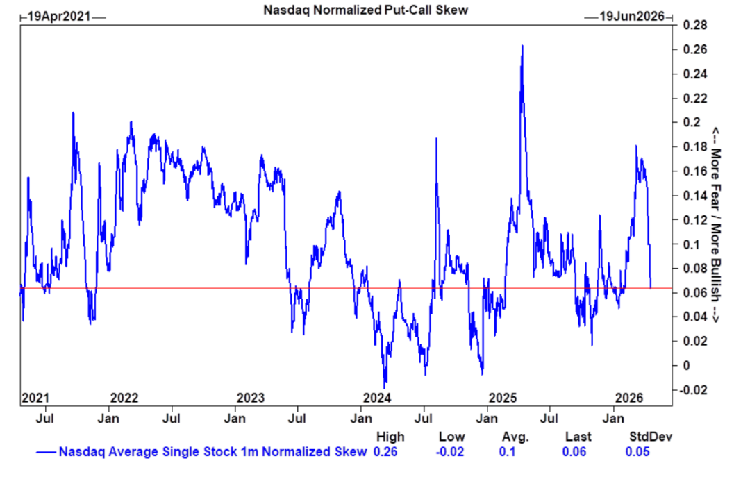 8、个股层面也呈现相同动态,偏斜度同样显著压缩。综合来看,这不仅仅是指数层面宏观对冲头寸的平仓,更是投资者整体仓位向短期上行机会倾斜的广泛转变,尤其是在财报发布前夕。