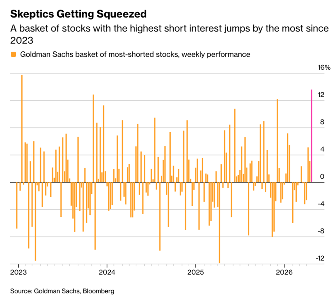 2、高盛编制的一篮子被做空最多的股票上周上涨超过13%,创下自2023年以来的最佳单周表现,并跑赢标普500指数9个百分点。根据S3 Partners的数据,市场空头上周已平仓价值930亿美元的头寸。