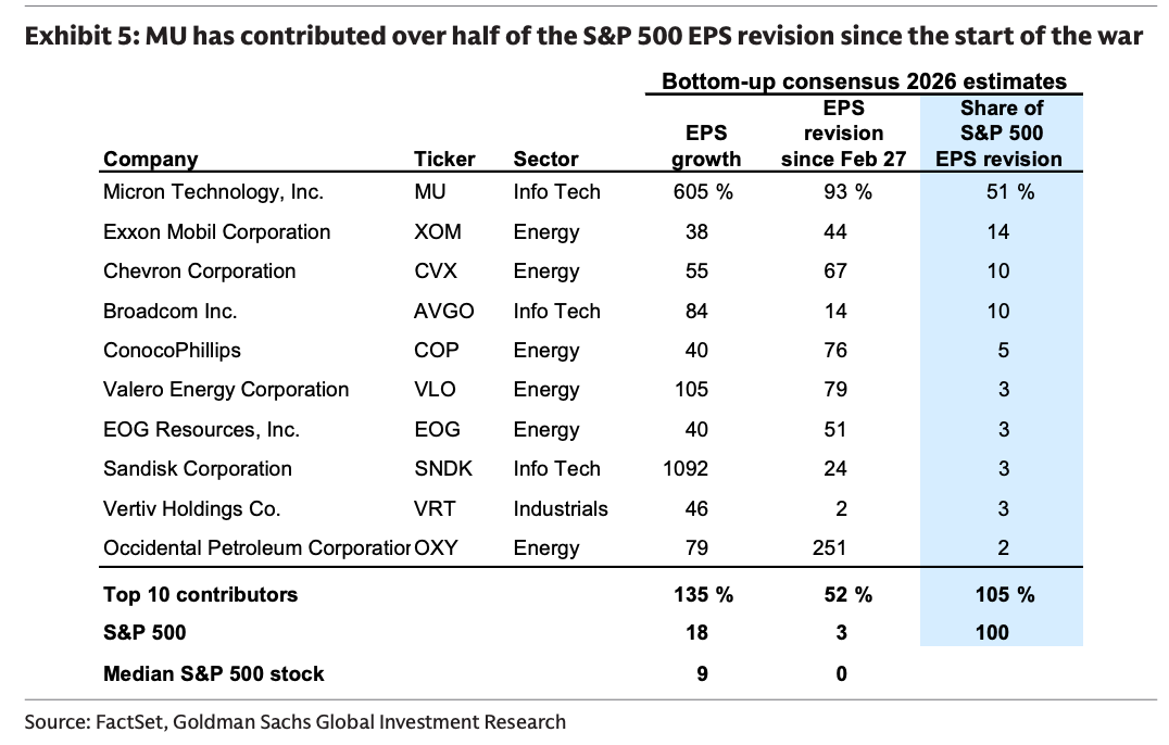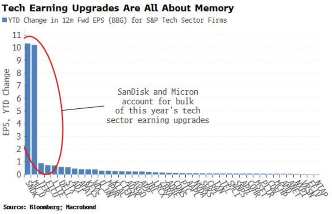 4、而在标普科技板块内部,年初至今的远期盈利上调主要由存储芯片公司推动,绝大部分源于闪迪(SanDisk)和美光(Micron)这两家公司。剔除这两家公司后,科技行业内其他公司的盈利上调幅度普遍平淡。