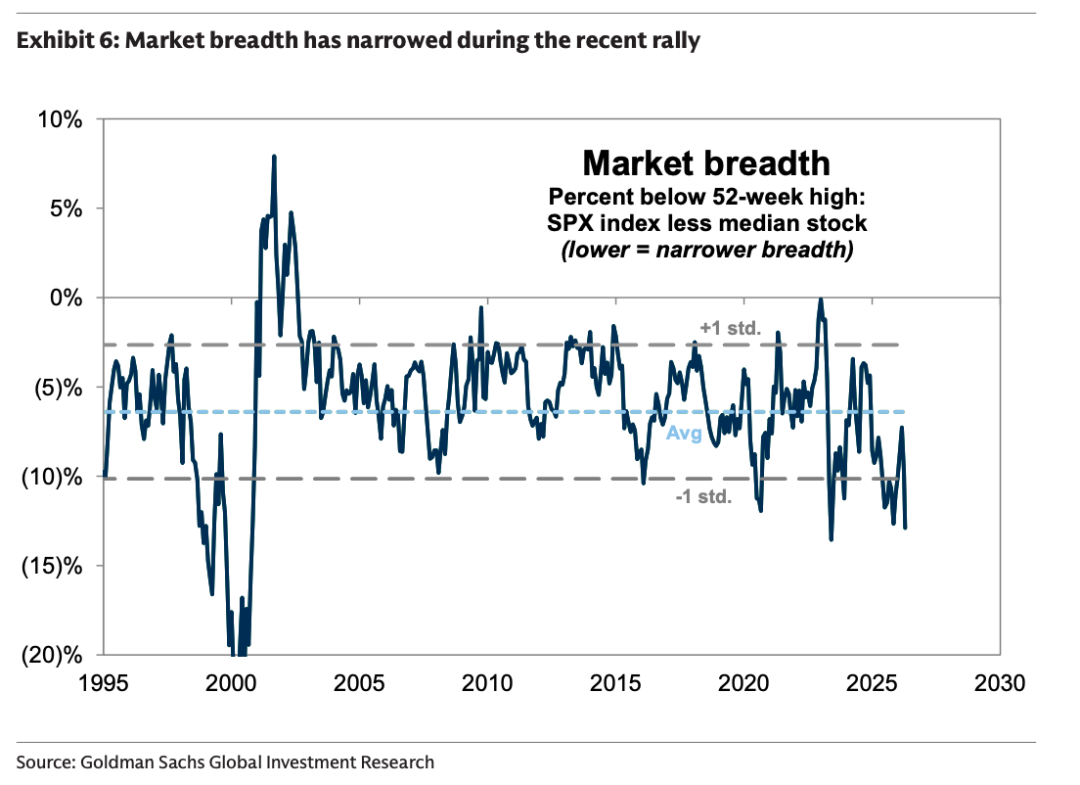 3、事实上,近几周对标普500盈利预期的大幅上调仅由少数几只股票驱动。仅美光科技(Micron Technology)一家就贡献了超过一半的上调幅度,其共识盈利预期在公司发布远超市场预期的季度财报和指引后几乎翻倍。而标普500成分股中位数公司的共识盈利预期基本未变。反映盈利预期上调高度集中,标普500的盈利修正广度(earnings revision breadth)近几周有所收窄。