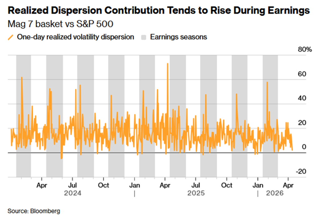 9、在财报季期间,“七巨头”相对于标普500指数的波动率离散度通常会周期性走高,其价格变动与大盘指数的关联性会阶段性减弱,从而为旨在捕捉个股与指数波动率差异的离散度交易策略提供了有利环境。