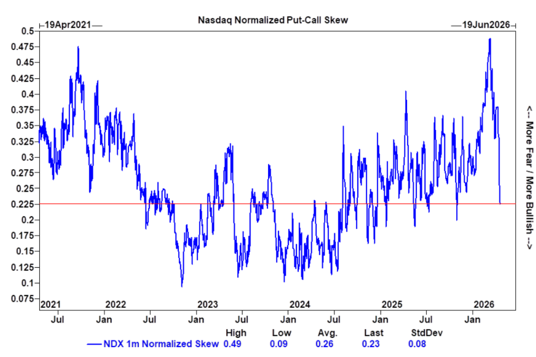 7、在科技板块内部,核心叙事依然未变:AI资本支出持续超出预期。市场共识仍持续落后于超大规模云服务商(hyperscaler)的实际支出,而基础设施端仍是该主题最清晰的体现。综上所述,市场已从由宏观驱动的去风险模式,直接切换回由AI驱动的投资剧本,并正在财报季前夕积极执行这一策略。 这一点在期权市场表现得尤为明显:纳斯达克100指数(NDX)短期行权价偏斜度(skew)已大幅下降,下行保护被解除,相对需求正转向上行方向。