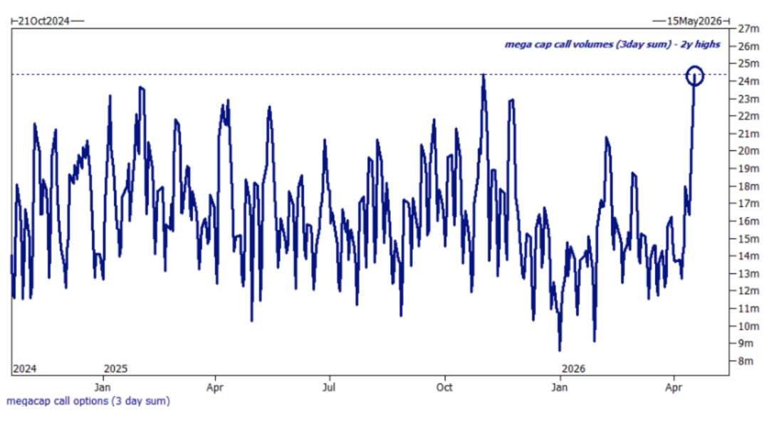 3、近期宏观对冲头寸的空头回补行为,有助于解释科技股与mag7本月至今的超额表现:每对冲1美元的SPY/ES1空头(此类对冲规模已相当可观),实际上等同于净买入37美分的“泛科技股”。过去三周中大盘股(megacap)相对于等权标普500指数的收益差达1,330个基点,为历史最宽之一;与此同时,大盘股看涨期权成交量亦急剧攀升。注:很多对冲基金当初建立SPY空头时,并未直接卖空SPY,而是通过卖空一篮子个股(尤其是高Beta、高权重的科技股)来合成空头敞口。因此,当他们现在回补这个空头时,必须买回这些被做空的个股才能平仓。
