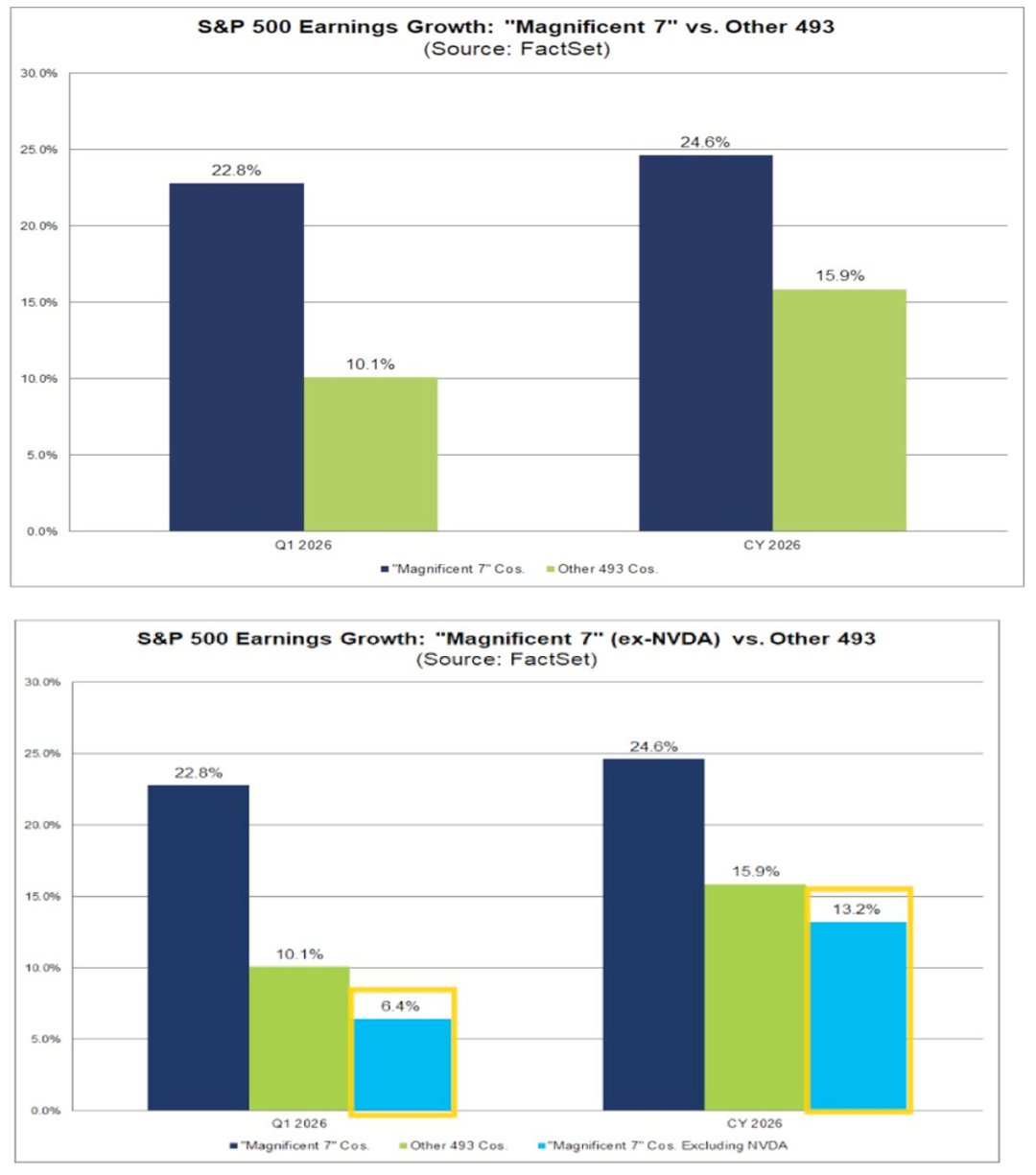 9、根据FactSet的数据,标普500指数成分股中,“七巨头”在2026年第一季度的预计盈利增长率达到22.8%,远超指数内其余493家公司的10.1%平均增速。不过,若将英伟达排除,“七巨头”的这一盈利增长预期将从22.8%骤降至6.4%,不仅低于整体水平,也显著落后于其余493家公司(特斯拉是主要拖累)。