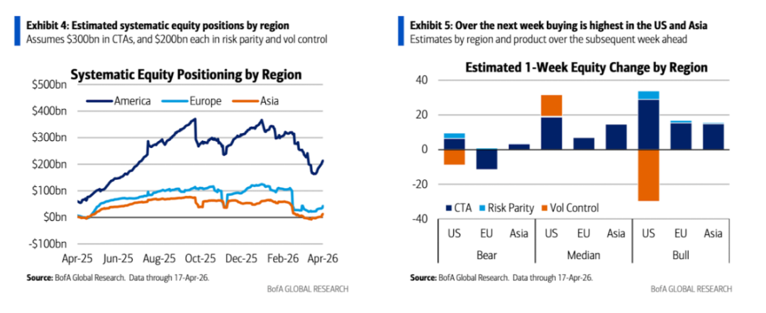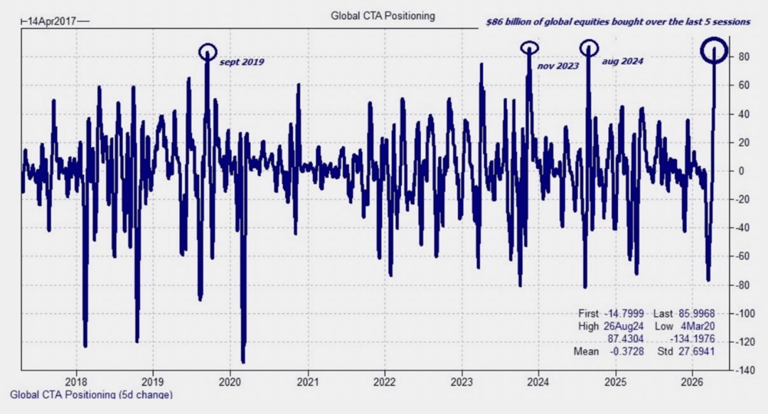 10、商品交易顾问(CTA)等系统性策略基金正在以创纪录的速度买入股票,过去一周内全球股票购买量达到约860亿美元,位列历史前五。高盛模型预测未来五个交易日内还将有约700亿美元的资金流入。